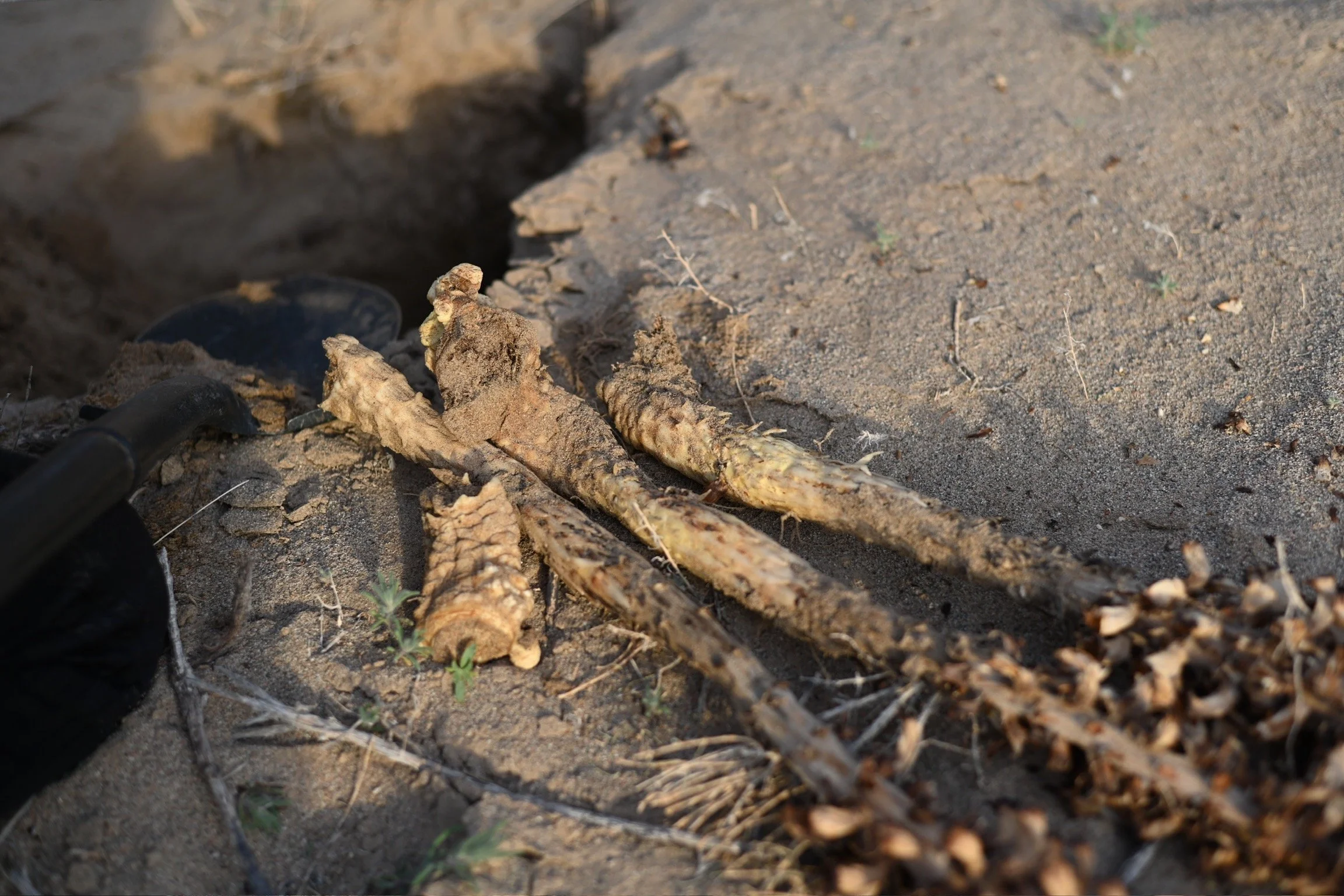 In the first image, one of our team members uncovers a mature Cistanche buried beneath the sand, its distinct segmented texture rich with years of nutrient absorption.The second l image shows the full harvest: long, golden-brown stems still clinging to desert soil.